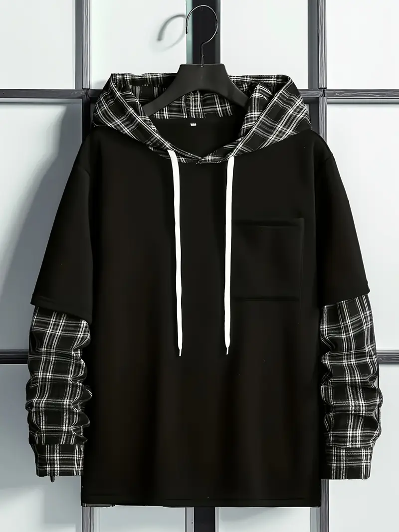 Black Plaid-Layered Hoodie / Fashion Patchwork Hoodie