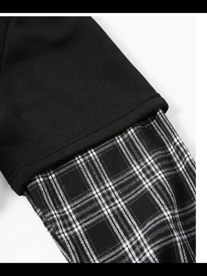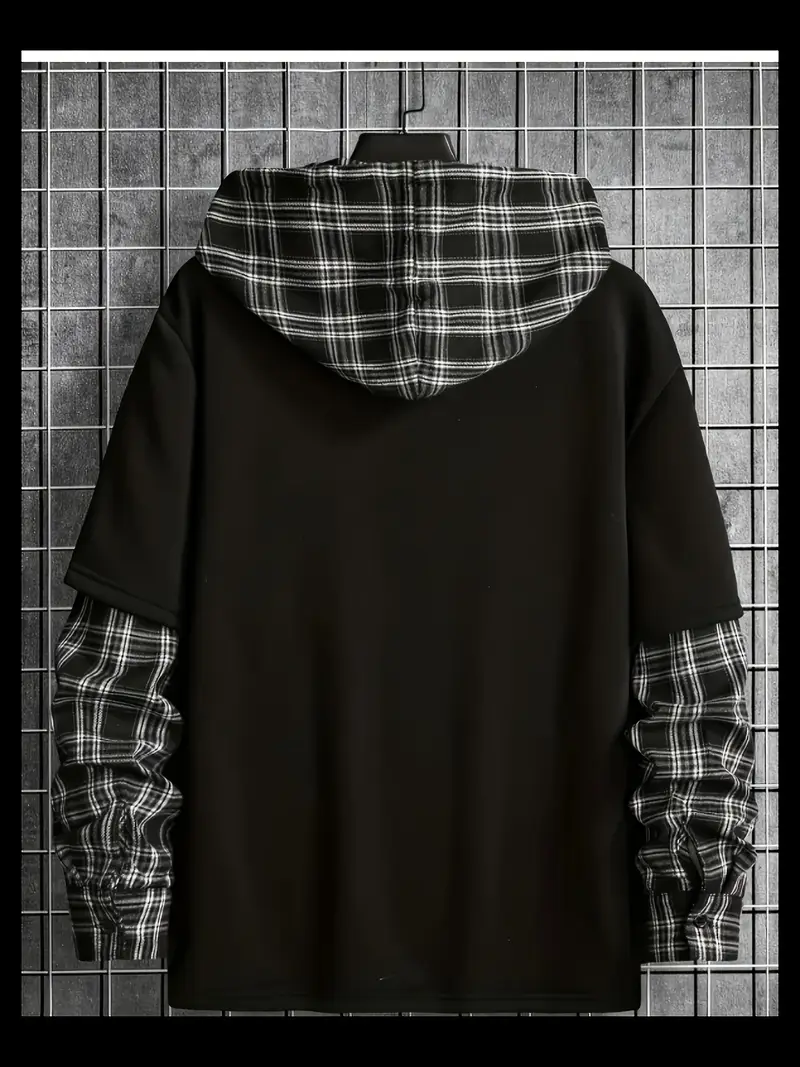 Upgrade your streetwear look with this Black Plaid Patchwork Hoodie, featuring a unique layered design that combines solid black fabric with stylish black-and-white plaid accents. The hoodie has a modern street-style aesthetic, with plaid sleeves and a matching plaid inner hood that creates a trendy layered effect without extra bulk.