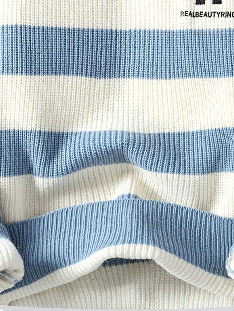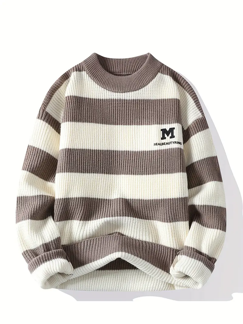 Stay cozy and stylish with this Classic Black & White Striped Knit Sweater, designed for a clean, modern look that works with any wardrobe. The bold horizontal stripes create a timeless aesthetic, while the embroidered “M – REAL BEAUTY RNG” logo on the chest adds a subtle touch of personality.