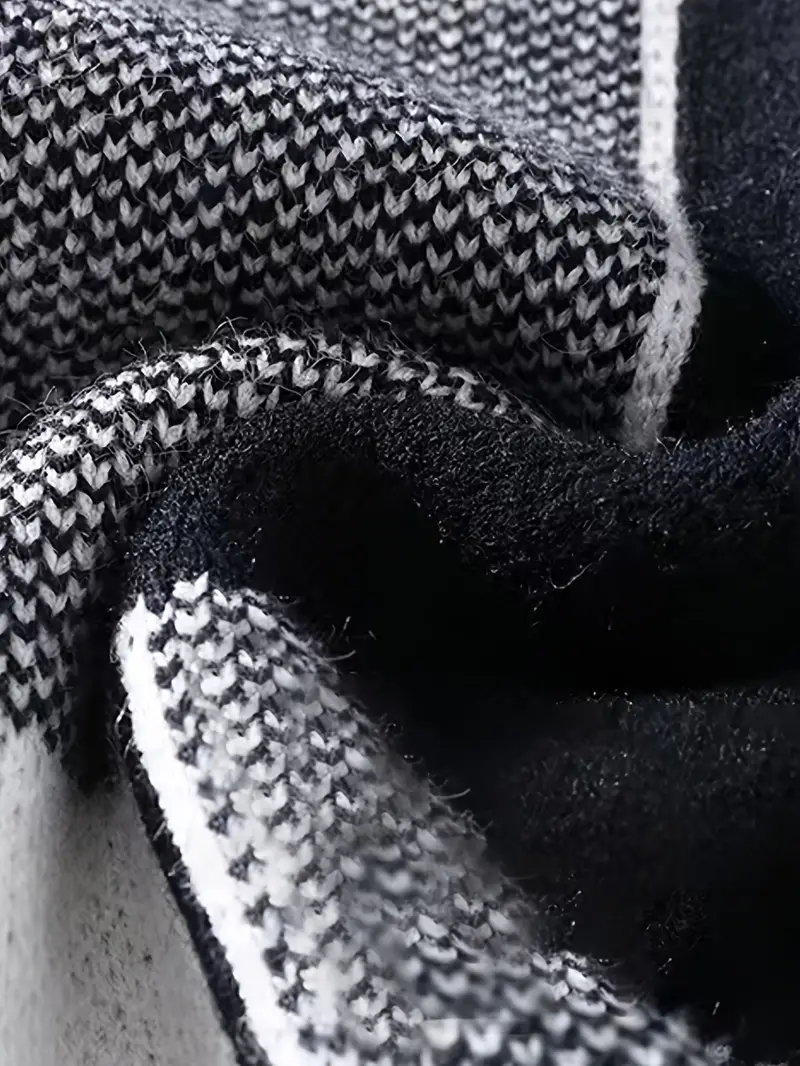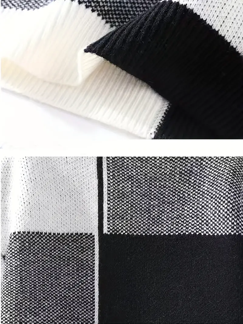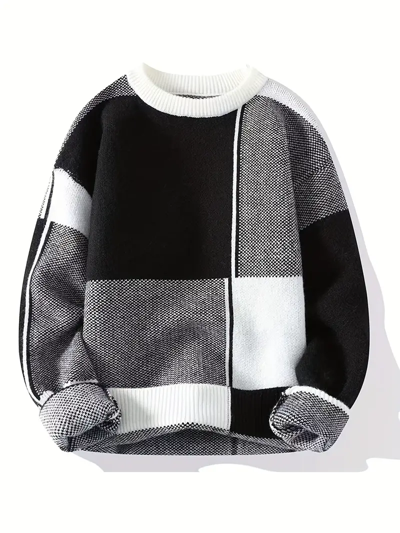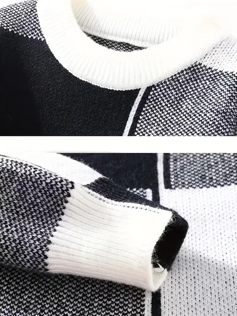 Step up your winter style with this Monochrome Geometric Block Sweater, featuring a bold black-and-white patchwork design for a striking modern look. Crafted from a soft and warm knitted acrylic blend, this sweater offers comfort without sacrificing style.
